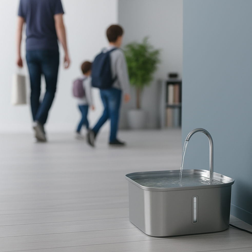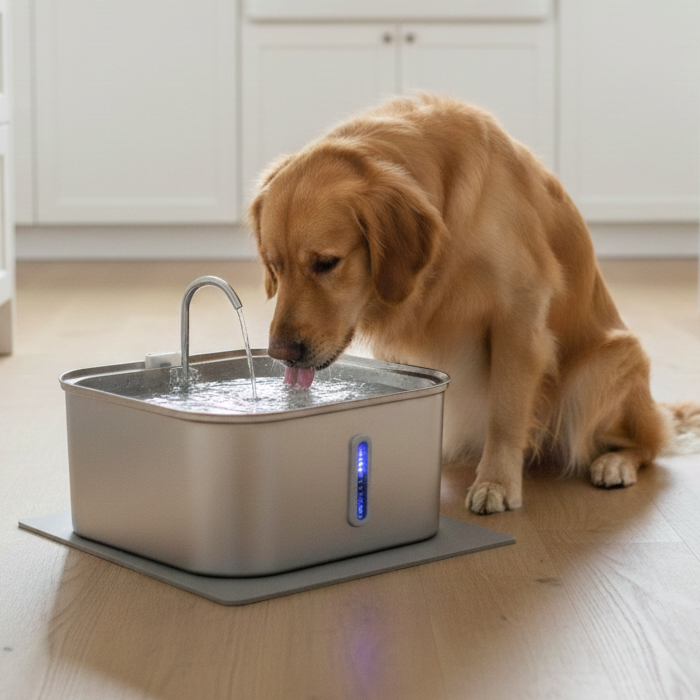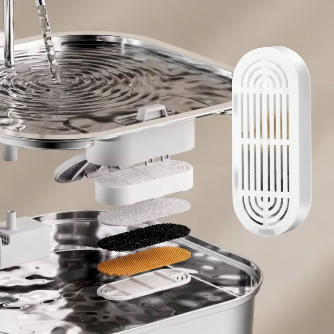Veterinary-inspired water fountain designed to provide a continuous flow of filtered water, encouraging pets to drink more and stay hydrated. Its multi-stage filtration ensures water freshness.
